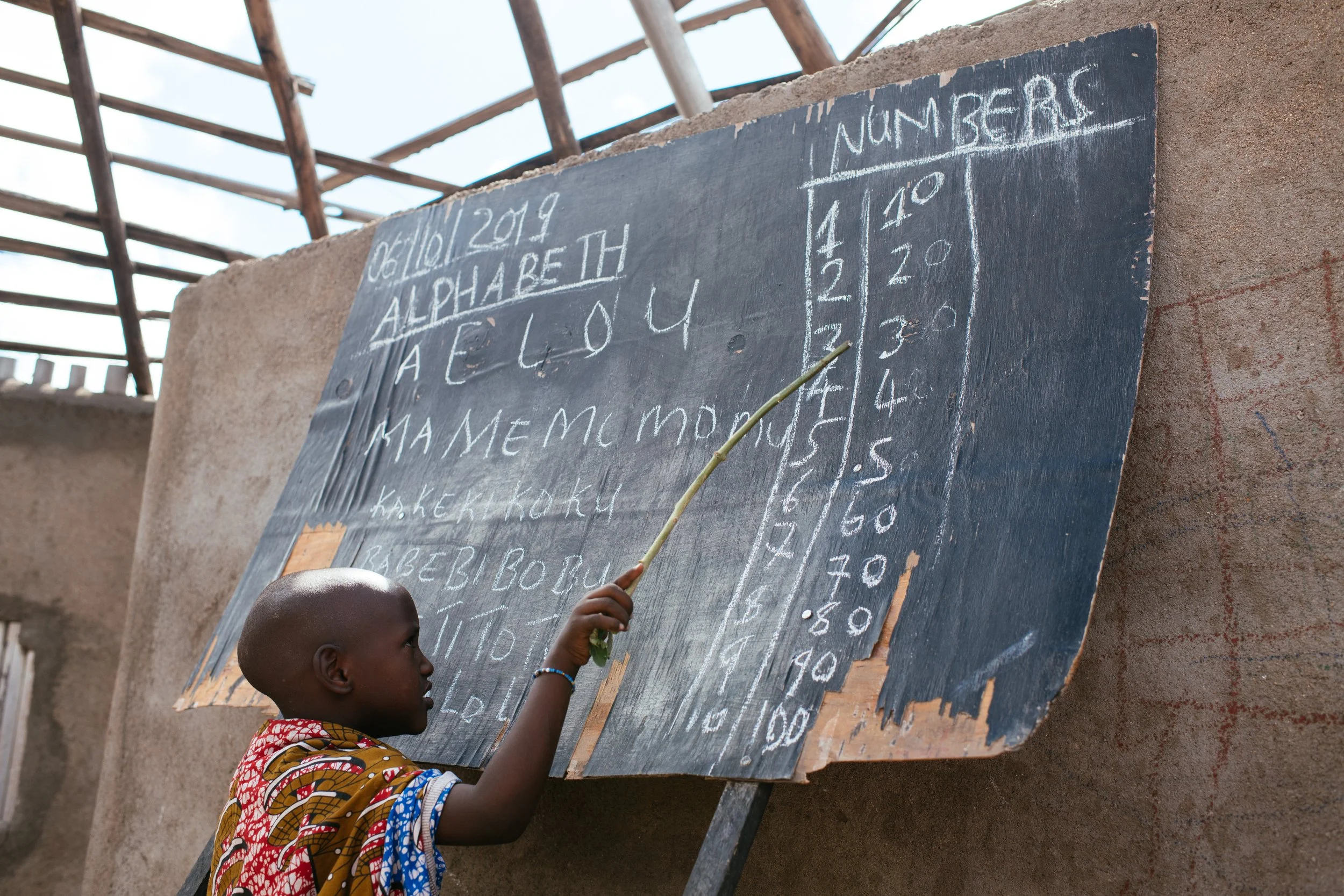 The next step is a visit to the school. The teacher, wearing a hat that seems to identify her as the person in charge, gives a clear signal to one of the kids, who starts reciting numbers while pointing to them at full speed in front of a wrecked chalkboard. The whole thing feels extremely rehearsed: As if they have done it about a million times for all kinds of white visitors. I suppose that the display betrays some unresolved anxiety between sticking to their traditional ways and preparing their children for the world beyond the Boma, beyond the village. Well, the lady in the hat explained that she takes care of the kids while the adults are at work, so no matter how make-believe this wrecked little school looks like to me, it seems that this is “the care economy” in action. Pooled care work if you will, for the whole community.